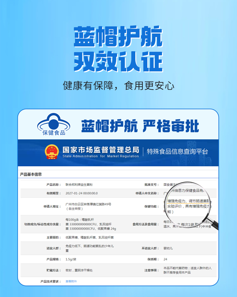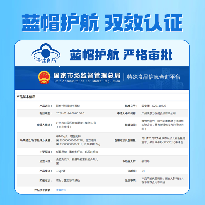 保健功能:有助于增強(qiáng)免疫力、有助于調(diào)節(jié)腸道菌群(經(jīng)動(dòng)物實(shí)驗(yàn)評(píng)價(jià),具有有助于增強(qiáng)免疫力的保健功能)