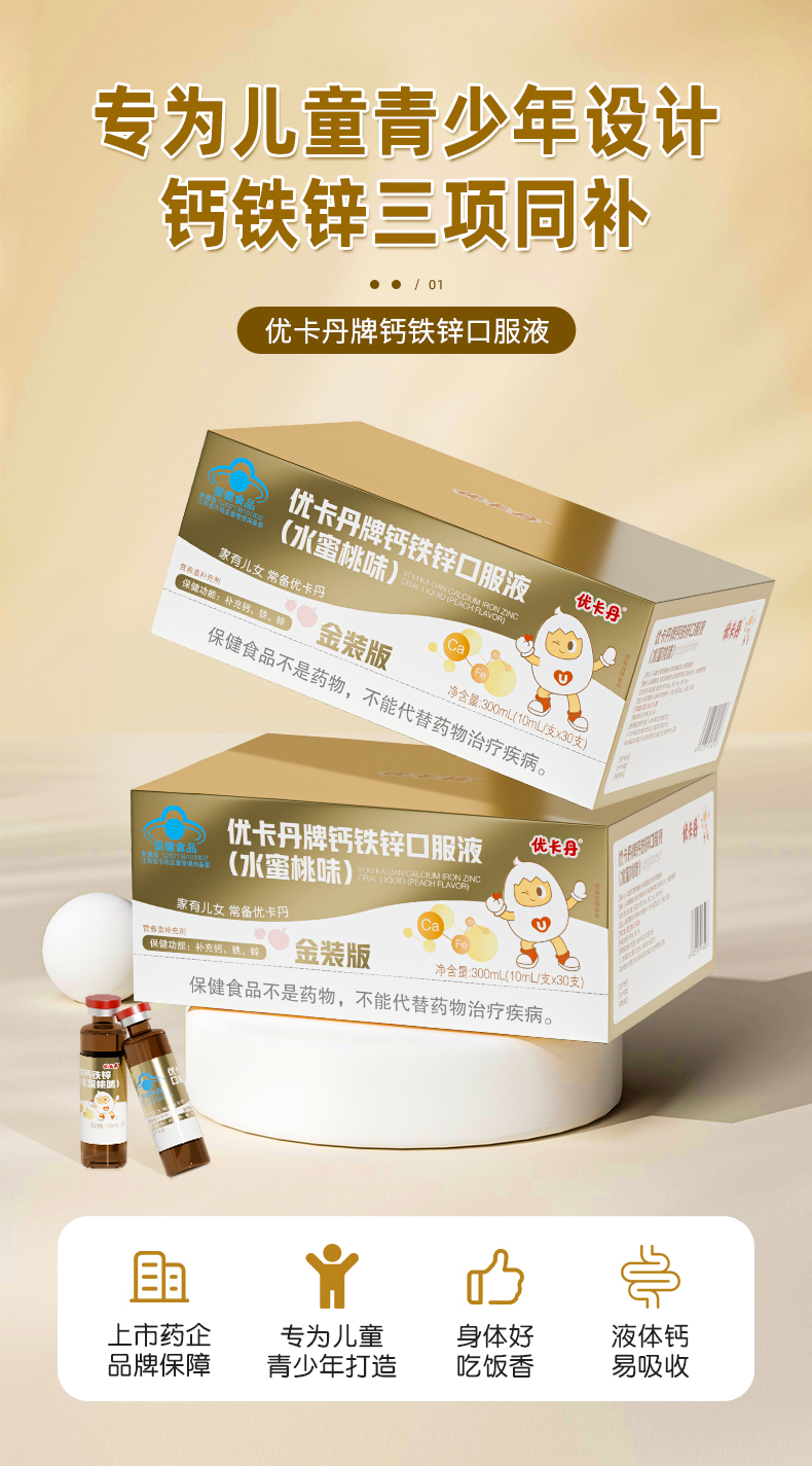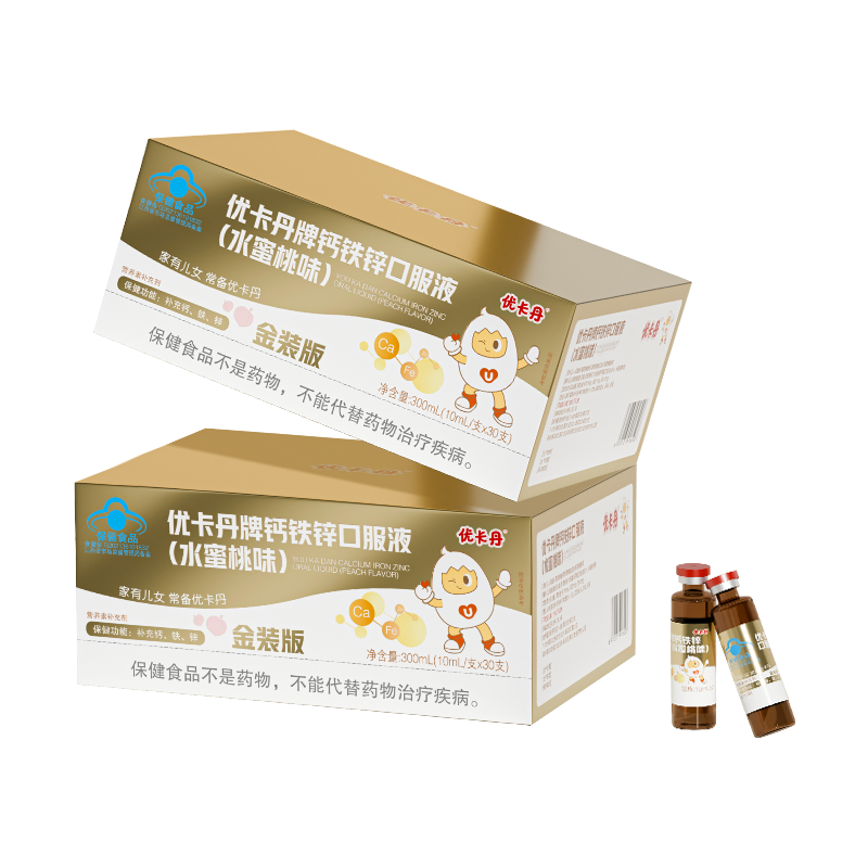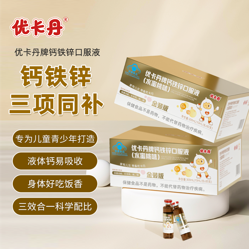 產品名稱:優卡丹牌鈣鐵鋅口服液(水蜜桃味)金裝版