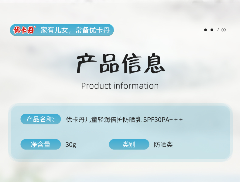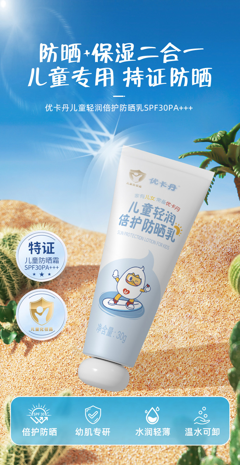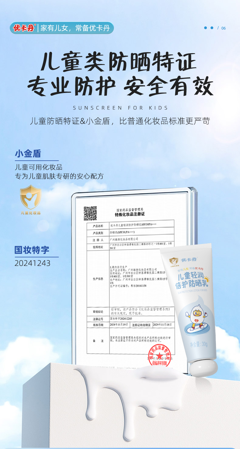 【產品名稱】優(yōu)卡丹兒童輕潤倍護防曬乳 SPF30PA+ + +