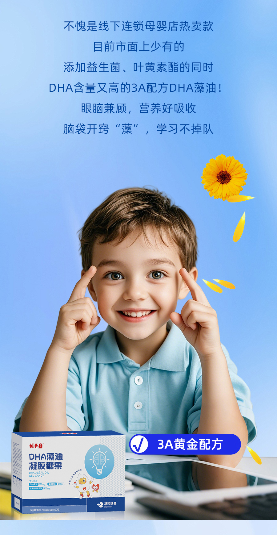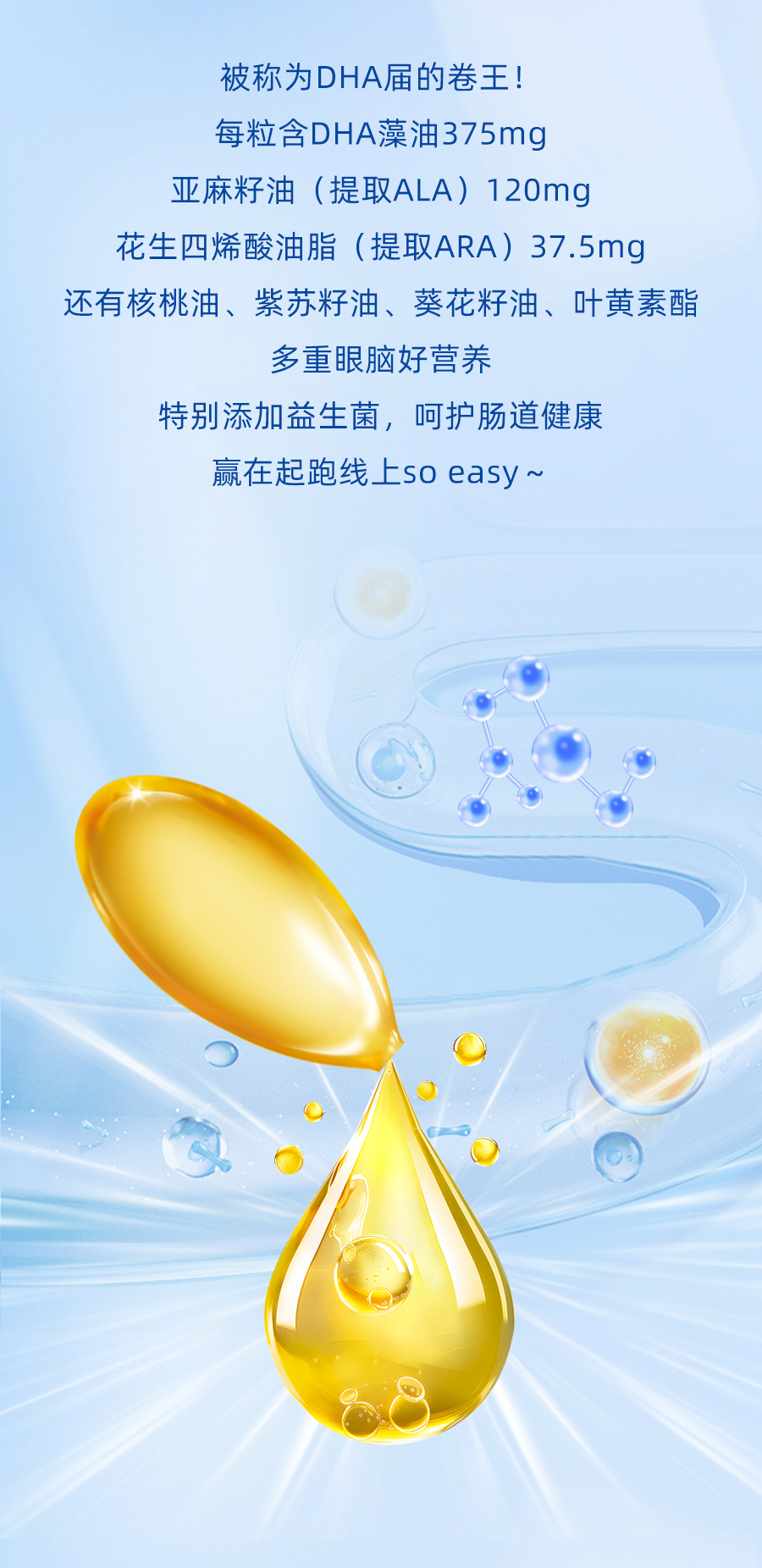 內料:DHA藻油375mg/粒 、亞麻籽油120mg/粒 、核桃油、花生四烯酸油脂37.5mg/粒 、紫蘇籽油、檸檬油、乳酸菌后生元粉(麥芽糊精、植物乳植桿菌RH03147、植物乳植桿菌HCS03-001、羅伊氏粘液乳桿菌HCS02-001)、葉黃素酯油懸液(葵花籽油、葉黃素酯)