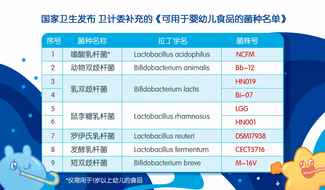 以優卡丹多株活性即食型乳酸菌為例,核心菌株均源自《可用于嬰幼兒食品的菌種名單》,特別配伍乳雙歧桿菌與鼠李糖乳桿菌LGG。
