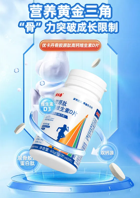 認識到單一補鈣的局限,優卡丹推出了骨膠原肽高鈣維生素D片,創新性地采用“骨膠原肽+高鈣”科學配方,為孩子的骨骼生長提供雙重動力。