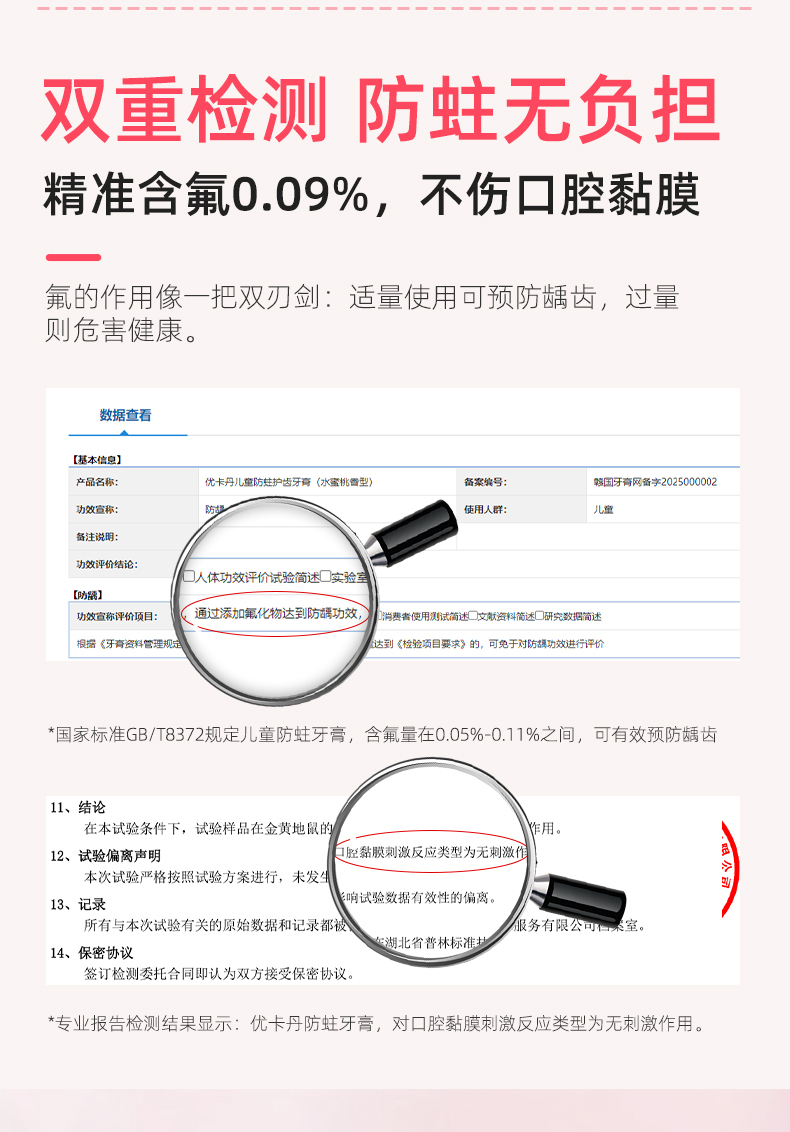 優(yōu)卡丹防蛀護(hù)齒牙膏將含氟量精準(zhǔn)控制在0.09%——這是經(jīng)過權(quán)威檢測(cè)驗(yàn)證的、適合兒童的安全有效濃度。既能溫和守護(hù)牙釉質(zhì),幫助抵抗蛀牙,又不會(huì)給孩子的牙齒發(fā)育帶來(lái)負(fù)擔(dān)。
