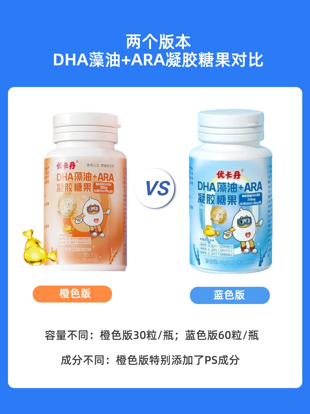 普通橙色版為30粒裝,每日2粒只夠半個(gè)月用量。寒假通常持續(xù)30-45天,藍(lán)色版60粒大容量設(shè)計(jì),正好完整覆蓋整個(gè)假期,媽媽們?cè)僖膊挥脫?dān)心孩子“營(yíng)養(yǎng)斷糧”。